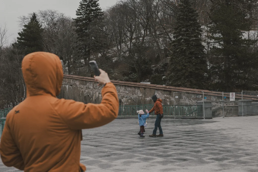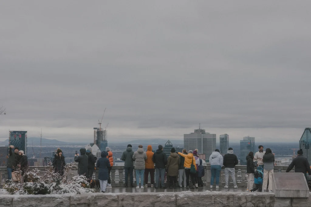When Kondiaronk Lookout opens, the city suddenly spreads far away below you and everyone turns toward it almost at the same time. Nobody speaks loudly. People stand shoulder to shoulder facing the skyline, holding coffee carefully just for warmth. Small conversations appear and dissolve in the air. I found myself raising the camera without planning to. Not for a perfect frame, just to keep the moment from ending too quickly.