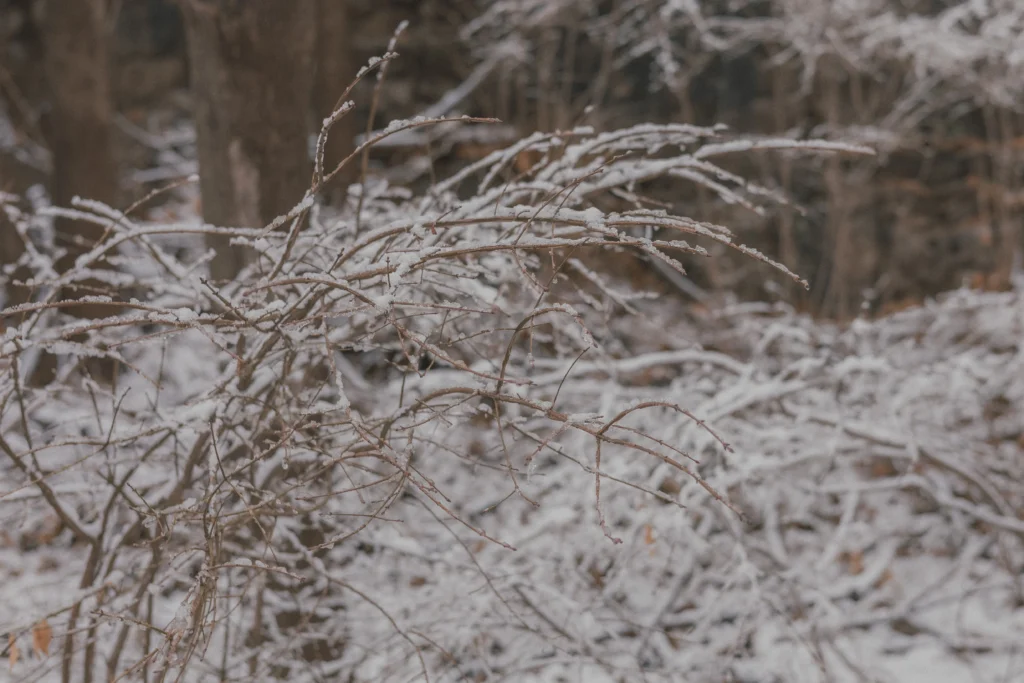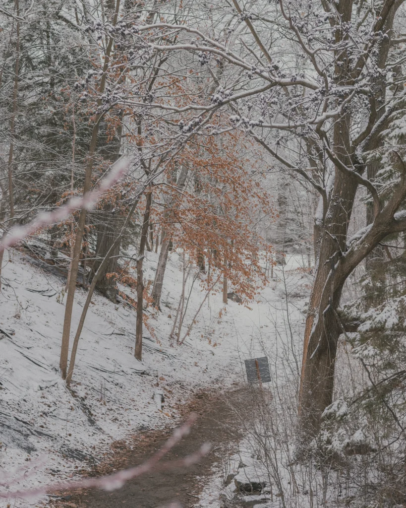 Walking back through the woods, the city disappears again. Snow absorbs most sounds. Footsteps press into the same tracks left by others, branches carry thick white weight, and the path narrows and widens without urgency. After a while you forget you are still inside a large city.