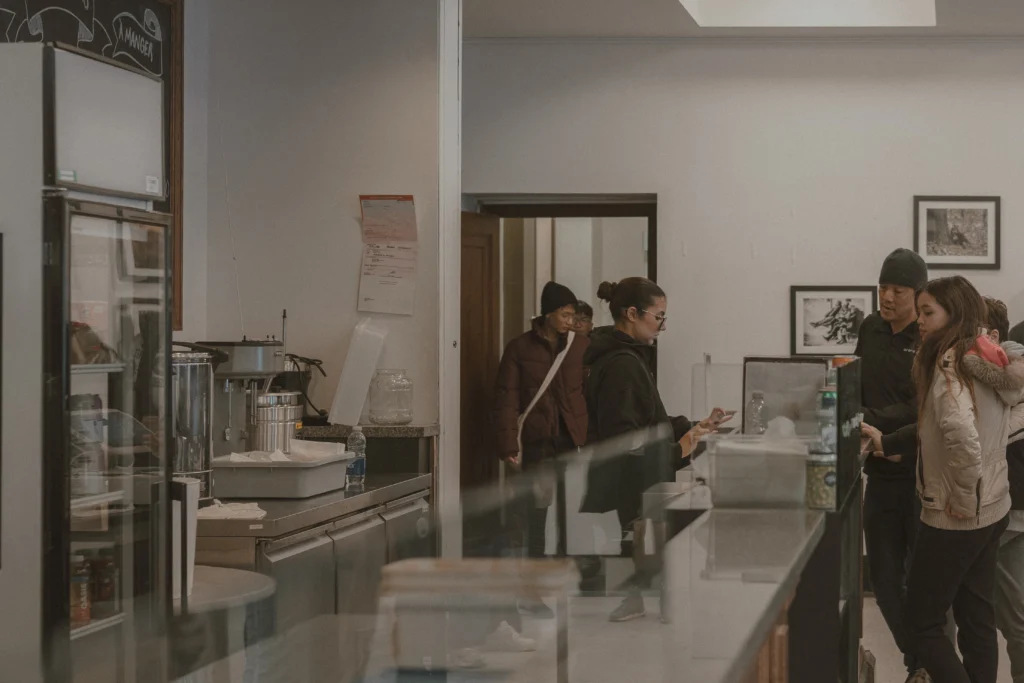 Winter changes how the city behaves. The light turns pale and flat, footsteps sound sharper on the sidewalks, and the day feels longer because nothing moves quickly. The morning began in a small café downtown. Warm cups between cold hands, fogged windows, people stepping inside in a hurry and brushing snow from their coats onto the floor. My fingers were still cold from holding the camera outside, and the lens kept fogging every time I came in. Outside everything kept moving. Inside nobody seemed to be in a rush.